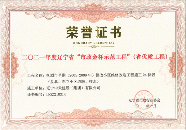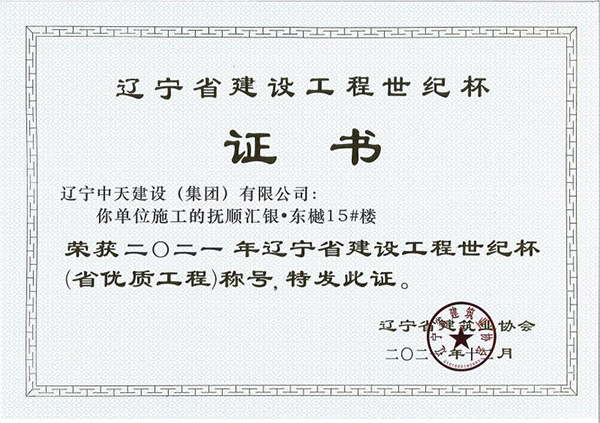 企業(yè)先后榮獲“全國(guó)優(yōu)秀施工企業(yè)”、 “中國(guó)AAA級(jí)信用企業(yè)”、“全國(guó)保障性安居工程建設(shè)勞動(dòng)競(jìng)賽先進(jìn)單位”、“遼寧省最受尊敬企業(yè)”、“遼寧省優(yōu)秀建筑業(yè)企業(yè)”、“遼寧省工程建設(shè)質(zhì)量管理優(yōu)秀企業(yè)”、 “遼寧省守合同、重信用企業(yè)”、遼寧省“AAA級(jí)信用企業(yè)”、 “撫順市安全生產(chǎn)先進(jìn)單位、紅旗單位”、“撫順市安康杯競(jìng)賽先進(jìn)集體”等多項(xiàng)殊榮。